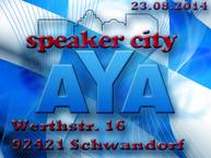 Am Samstag, den 23.08.2014 war die AYA zum zweitenmal zu Gast bei Speaker City in Schwandorf. Bei für die Juroren angenehmem und dennoch sonnigem Wetter besuchten 40 Starter den Wettbewerb. Morgens gab es traditionell Weißwurst und Brez'n zum Frühstück und tagsüber wurde gegrillt, sodass niemand verhungern musste. Gegen 17h fand die Siegerehrung statt und im Anschluss ging es mit einigen Teilnehmern, Juroren und dem Gastgeber Alexander Maier zur Segelschule Steinberg am See, wo der Tag bei leckerem Essen und einer Liveband dann einen würdigen Abschluss fand.
