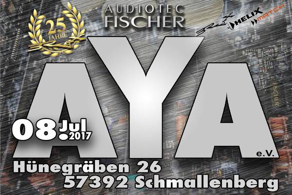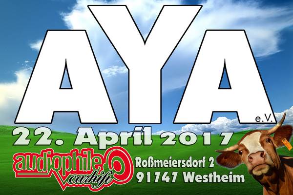 Am 17.6.2017 findet erstmalig zum 15-jährigen Bestehen die Kramer Sound&Musik AYA in Weilmünster statt. Die Inhaberin Sylvia Kramer und ihr Mann und langjähriges AYA-Mitglied Holger von Kramer Sound & Musik sowie Klaus Methner von KoMET Engineering nebst Team sorgen für einen sicher tollen Tag sowie für die kulinarischen Wünsche. Eingebettet ist das Ganze in die 800-Jahr Feier von Weilmünster, wo es auch für die kleinen Besucher Attraktionen gibt.